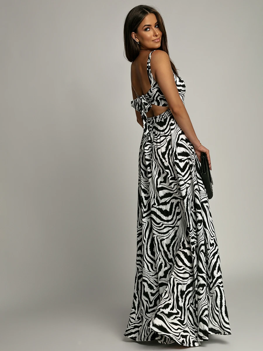 Kombinezon NB SEBBRA to propozycja dla miłośniczek zwierzęcych wzorów i wakacyjnego luzu. Dopasowana góra z wiązaniem z tyłu pięknie podkreśla sylwetkę, a cienkie ramiączka zapewniają lekkość i komfort noszenia. Gumka w pasie pozwala na idealne dopasowanie, natomiast szerokie nogawki nadają stylizacji swobodnego, letniego charakteru. Całość zdobi efektowny czarno-biały print w zebrę, który przyciąga wzrok i dodaje kreacji wyrazistego, oryginalnego akcentu.