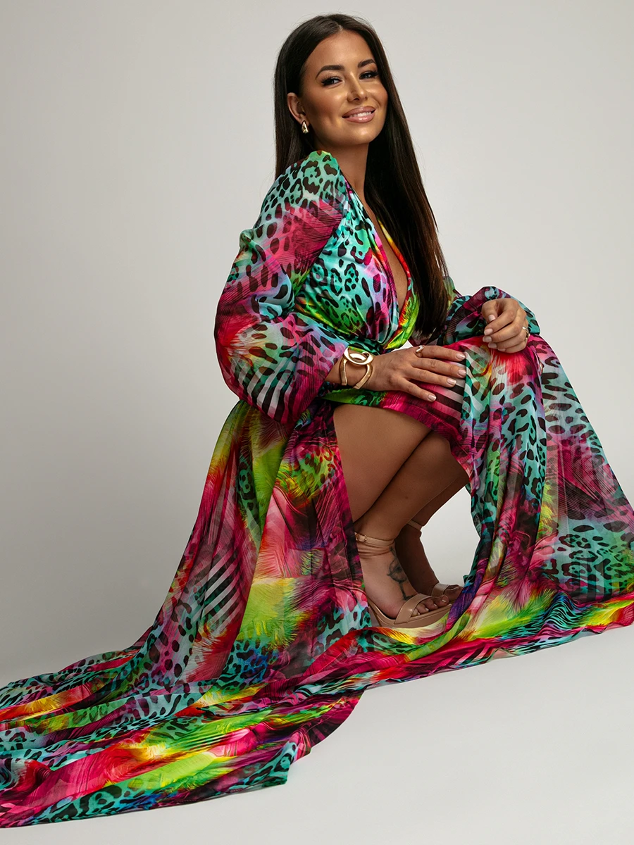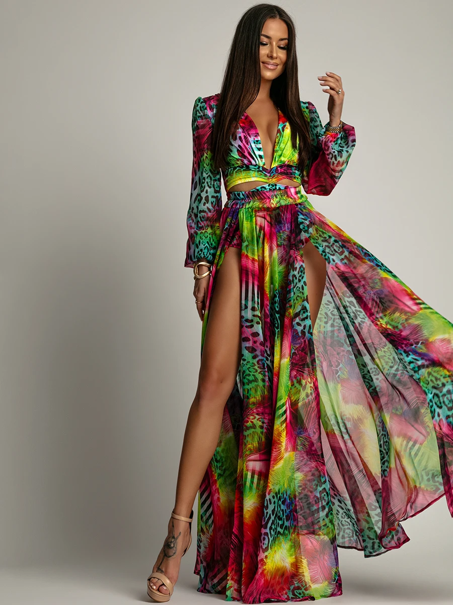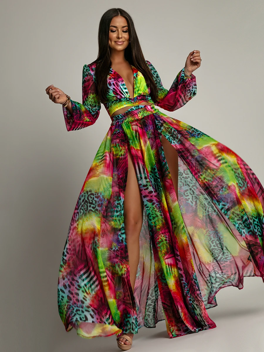 Komplet NB Vacay to idealny wybór na letnie dni i wakacyjne wyjazdy. Body z wycięciem w talii i długim rękawem wykonane z lekkiego materiału zapewnia komfort nawet w upalne dni, a mocno wycięty dekolt dodaje mu seksapilu, zachowując przy tym elegancki styl. Spódnica z elastyczną gumką w pasie pięknie modeluje sylwetkę, a subtelne rozcięcia na obu nogach wprowadzają lekkość i efektowny akcent. Cały zestaw tworzy stylowy, przyciągający uwagę look, który pozwoli poczuć się wyjątkowo podczas każdej wakacyjnej przygody.