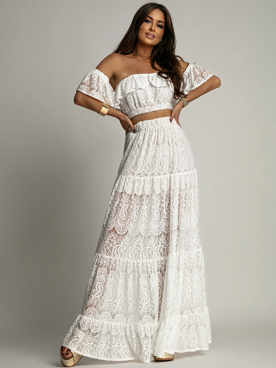 Komplet koronkowy NB Desperado to lekka i stylowa propozycja z ażurowego materiału, składająca się z krótkiego topu i spódnicy maxi, które subtelnie podkreślają sylwetkę. Top ozdobiony falbanką u góry oraz gumką w pasie pozwala na idealne dopasowanie, a spódnica o klasycznym kroju z gumką w talii zapewnia wygodę i komfort noszenia. Wewnętrzne podszewki w neutralnym kolorze dbają o komfort, a komplet dostępny jest w dwóch uniwersalnych odcieniach – klasycznej bieli i eleganckiej czerni.