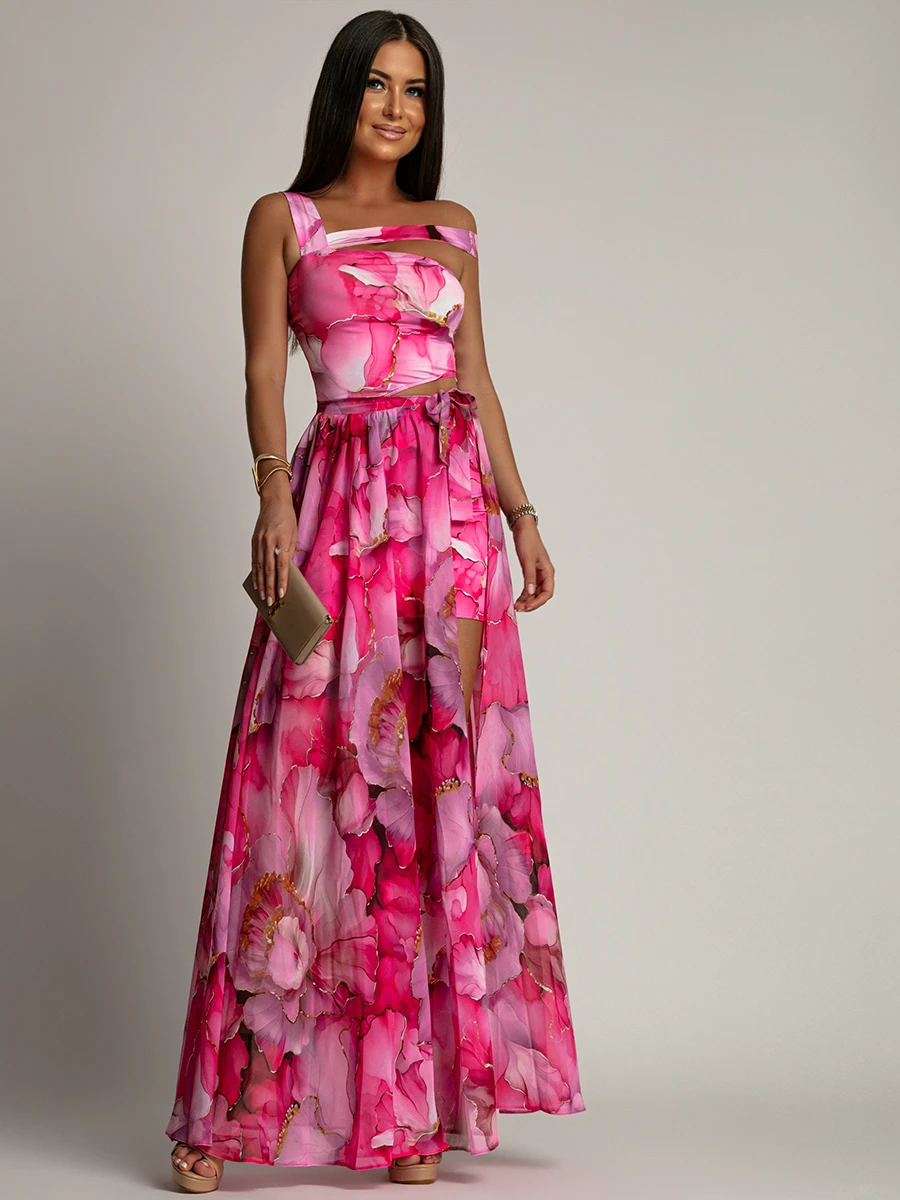 Sukienka maxi Magnos to wyjątkowa propozycja dla kobiet, które cenią różnorodność i lubią bawić się modą. Dzięki przemyślanemu designowi możesz nosić ją na dwa sposoby – jako elegancką mini na wieczorne wyjścia albo jako lekką, plażową maxi po połączeniu z dołączoną szyfonową spódnicą. Wykonana z elastycznego, lekkiego materiału, świetnie dopasowuje się do sylwetki, podkreślając jej atuty i zapewniając komfort noszenia. Model na jedno ramię z subtelnymi wycięciami w górnej części i talii dodaje całości lekkości oraz nuty seksapilu. Kolorowy print z różowymi kwiatami przyciąga spojrzenia i wprowadza wakacyjny klimat, który idealnie sprawdzi się zarówno na plaży, jak i na letnim spotkaniu. Sukienka Magnos to must-have w szafie każdej kobiety, która chce wyglądać stylowo i oryginalnie niezależnie od okazji.