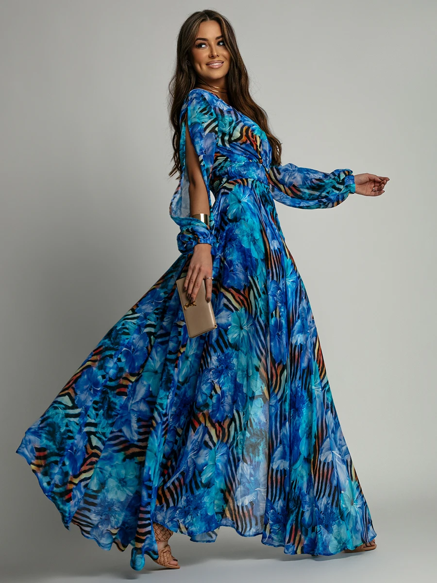 Sukienka maxi NB Oia w długości maxi to idealny wybór na letnie wakacje. Wykonana z lekkiego szyfonowego materiału, zapewnia komfort i swobodę ruchów. Luźne rękawy oraz rozcięcie na środku dodają sukience lekkości i subtelności. Wewnątrz wszyta spódnica gwarantuje wygodę noszenia. Dopasowana talia pięknie podkreśla sylwetkę, a luźny dół nadaje wakacyjnego charakteru. To doskonała propozycja na wieczorne spacery po plaży czy romantyczne kolacje przy zachodzie słońca. Kobieca, uwodzicielska i niezwykle stylowa – w tej sukience poczujesz się wyjątkowo i przyciągniesz spojrzenia.