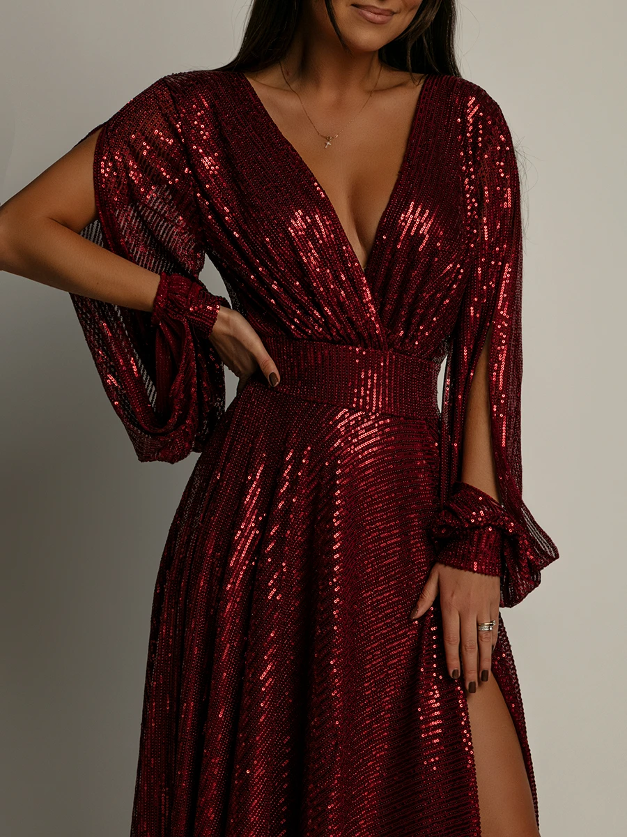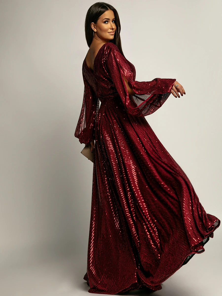 Sukienka wieczorowa NB o długości maxi to kwintesencja elegancji i nowoczesnego stylu. Kopertowy dekolt subtelnie eksponuje biust, a długie rękawy z rozcięciami dodają całości lekkości i zwiewności. Wygodna gumka w talii podkreśla sylwetkę, a luźno puszczona spódnica sięgająca ziemi wprowadza powiew lekkości przy każdym kroku. Wysokie rozcięcie na udzie dodaje zmysłowego charakteru, zachowując przy tym wyrafinowany wygląd. Idealna na formalne uroczystości, wesela, bale czy romantyczne kolacje, pozwalając poczuć się wyjątkowo i komfortowo.