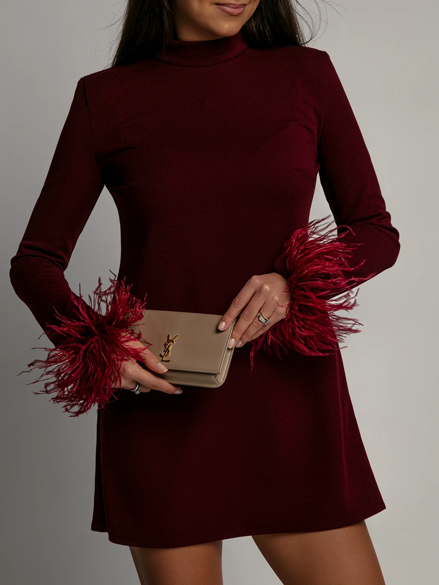 Sukienka z piórami NB Merelli w odcieniu głębokiego bordo to wyjątkowa propozycja dla kobiet, które cenią klasykę w nowoczesnym wydaniu. Uszyta z delikatnej, lekkiej tkaniny, ma prosty fason mini, który subtelnie podkreśla kobiecą figurę. Model zapinany jest przy dekolcie na drobne guziki, co nadaje mu eleganckiego charakteru. Sukienka nie posiada podszewki, dzięki czemu pozostaje komfortowa i przewiewna. Najbardziej efektownym elementem są rękawy zdobione piórami, które na stałe wszyto w materiał – to właśnie one nadają kreacji niepowtarzalnego, luksusowego akcentu. To idealny wybór na przyjęcia, uroczystości czy wieczorne spotkania, gdzie chcesz olśnić swoim stylem i wyróżnić się z tłumu.